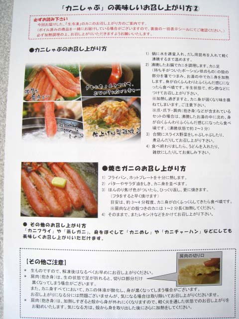 アメリカ産のズワイガニ1kgです。 | お礼状や小冊子が入っていました。 |